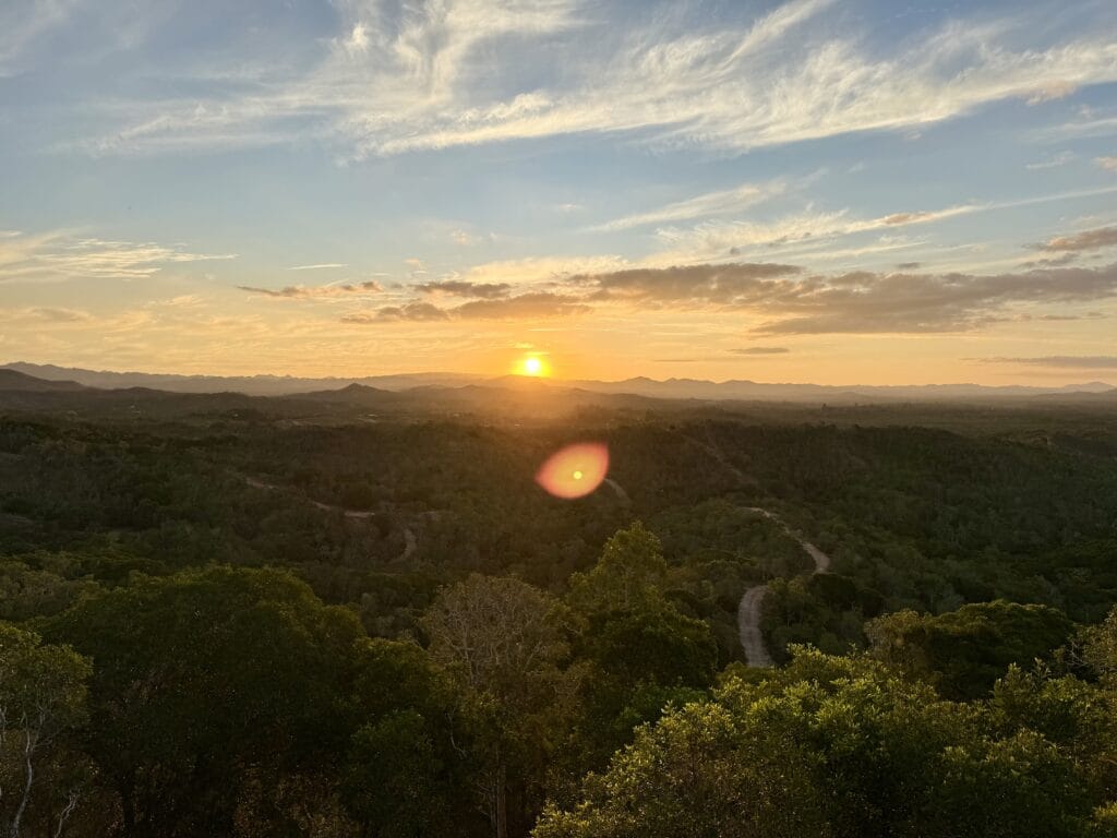 Après un petit temps calme pour l’équipe, Ricky débarque avec son « mule », un genre de buggy tout terrain sur lequel on embarque pour une dernière aventure. A travers les plaines de niaoulis, au détour des chemins parsemés de plantes endémiques, on déboule sur quatre roues motrices en chantant à tue-tête. Montée, descente, montée, montée et, perchés tout là-haut, Ricky nous offre un dernier moment de félicité : un sunset sur une magnifique terrasse « faite main » et construite face à la chaîne montagneuse de Tiebaghi et au pic d’Arama. C’en est presque trop et si la brigade du kiffe passe nous contrôler, cette fois c’est certain, on prend perpèt’ ! La nuit laisse enfin échapper ses ribambelles d’étoiles pendant que nous saluons l’organisation de ce séjour incroyable en échangeant avec le patron des lieux et en le remerciant mille fois. Son incroyable talent et ceux qui l’entourent nous ont offert un moment d’éternité qu’on n’est pas près d’oublier !